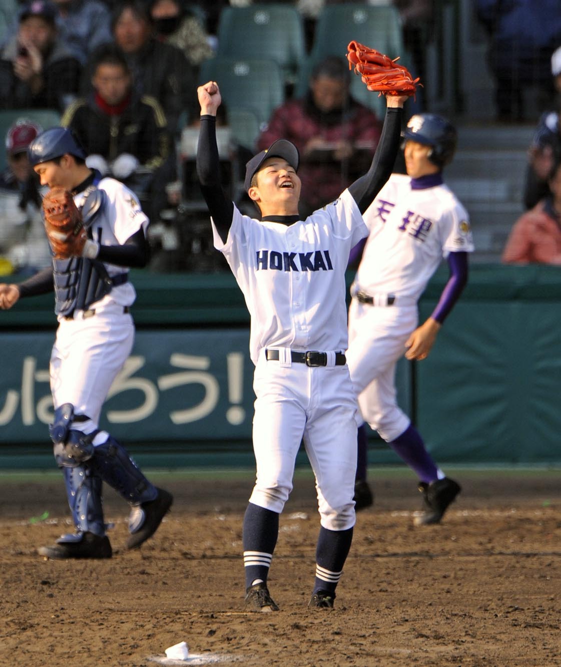 2011年3月28日、選抜甲子園2回戦・北海×天理、九回、最後の打者を打ち取り、ガッツポーズを見せる北海・玉熊(中央)