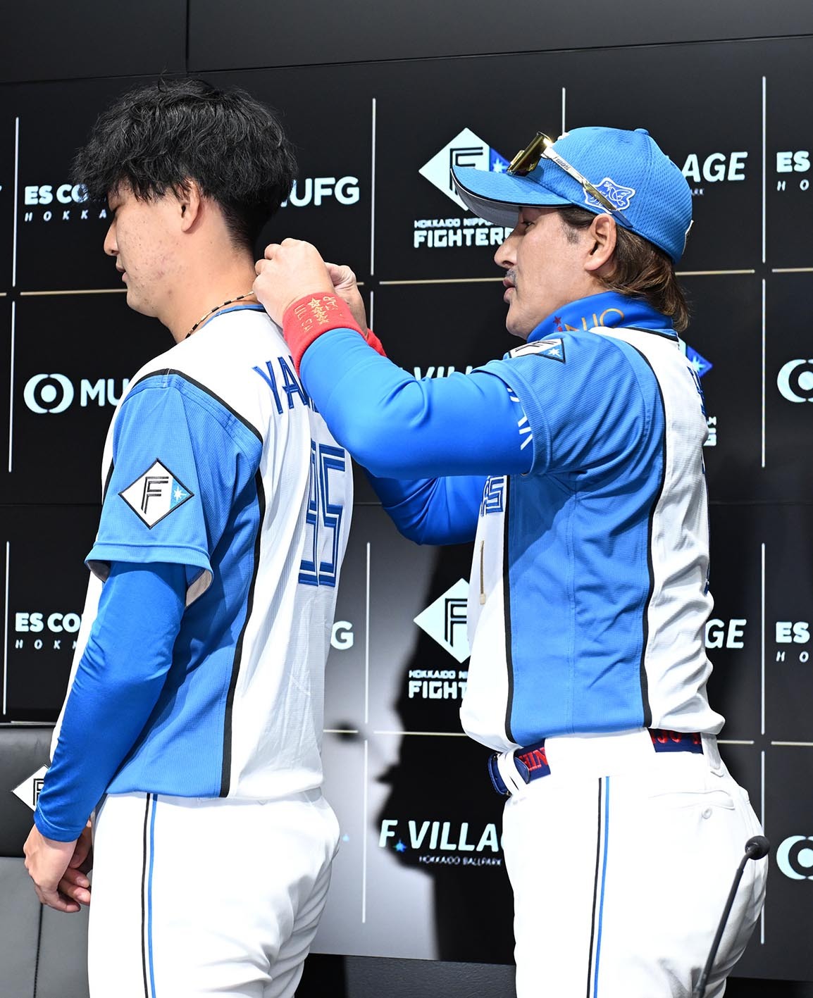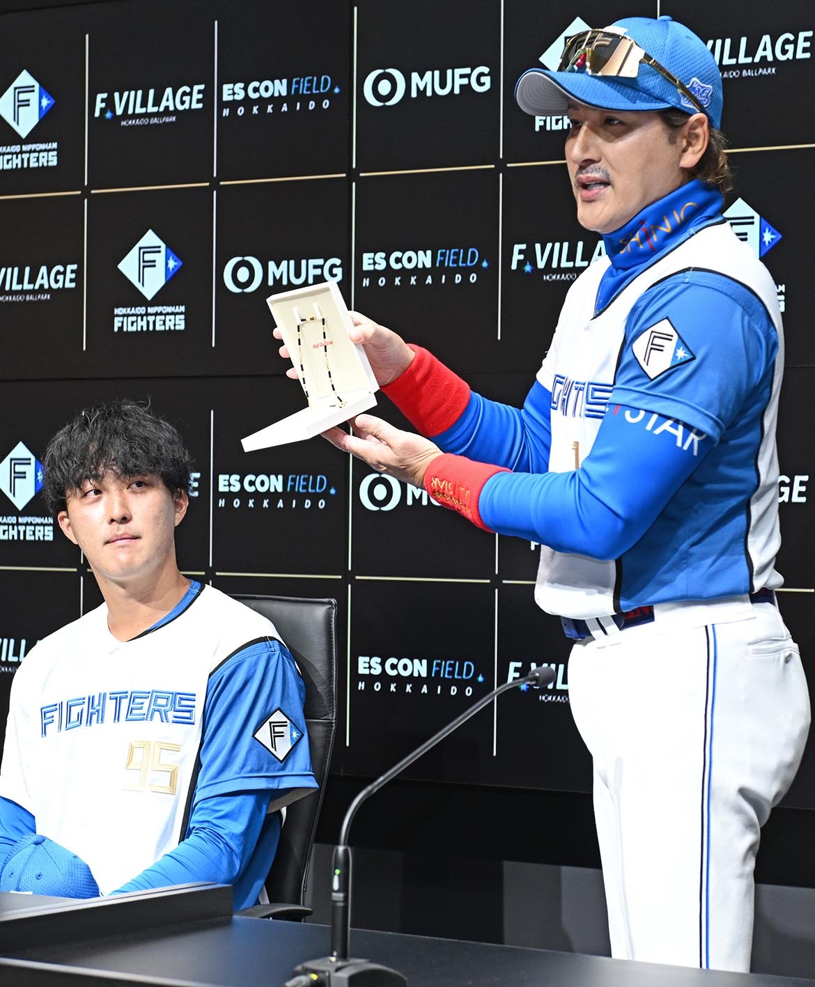(新庄監督)「恒例じゃないですけど、福島くんにはスーツで、柳川くんにはこのネックレスを渡したいと思います」