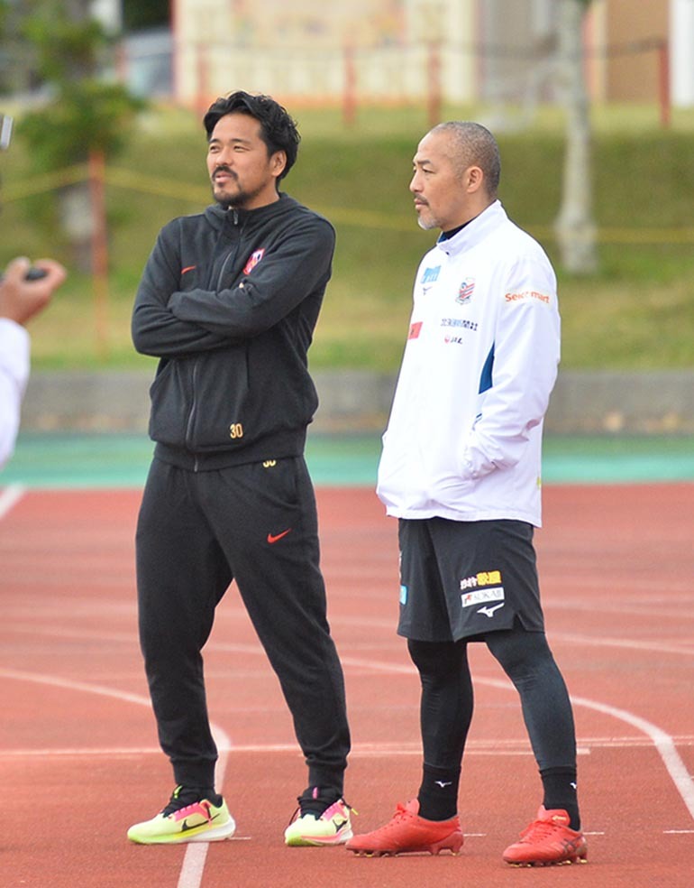 小野O.N.O(右)は練習見学に訪れた浦和FW興梠と会話を交わす
