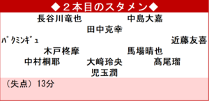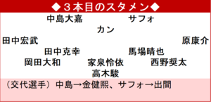 「メッセージは、そんなに込めてないです。残り2試合ありますし、熊本へ行ってからも2試合ある。全体の中でいろいろな組み合わせを見る。とはいえ、どこもスタートダッシュを狙って行かないといけない。バラバラにメンバーを組んで、チーム作りが間に合わないことがないようにしないと。その辺のバランスを見ながら考えました」