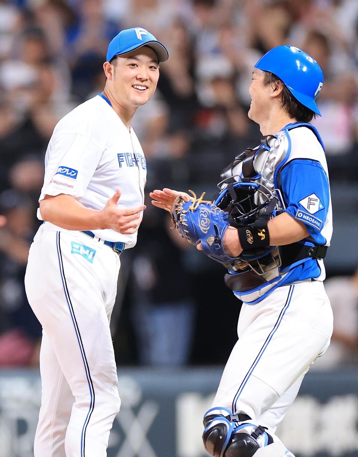 7月4日の楽天戦で勝利を喜び合う斎藤(左)と伏見のバッテリー