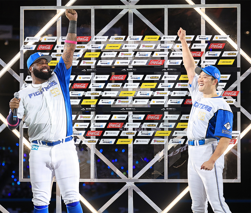10月12日 、CS1st 対オリックス、ヒーローインタビューで一緒に拳を上げるレイエス(左)と斎藤