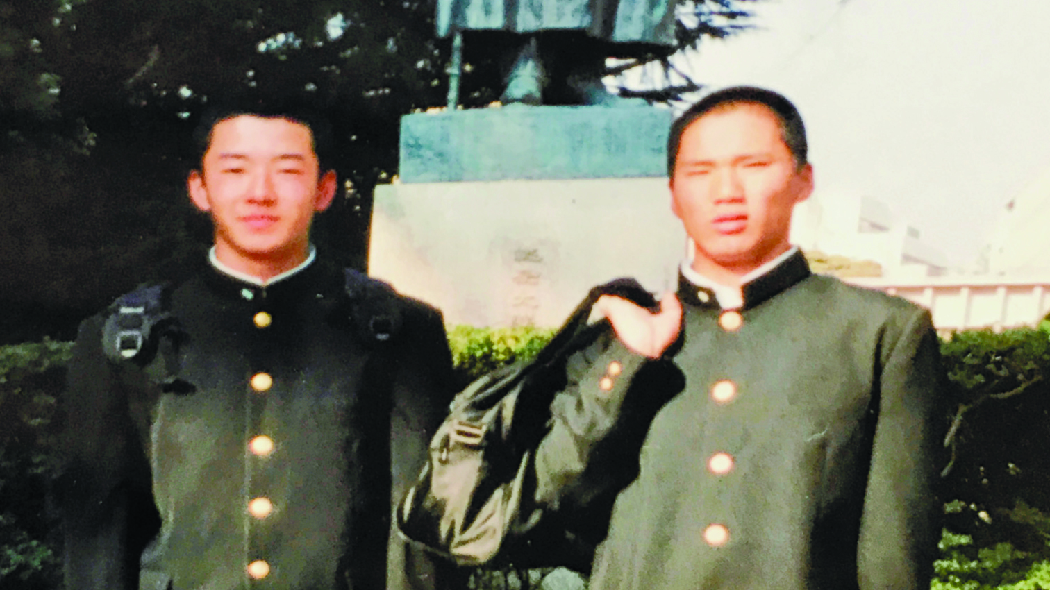 早実高入学式の日。帰りに早大キャンパスに立つ大隈重信像を背に、2人で写真に納まった。船橋悠さんは印象に残る二つのエピソードがある。