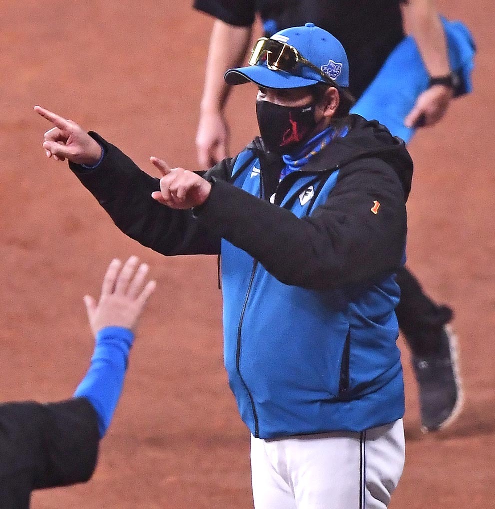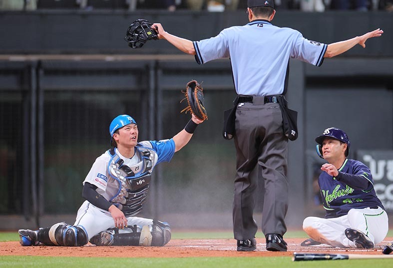 一回1死一、二塁、ヤクルトが先制した場面でリプレイ検証を要求する新庄監督