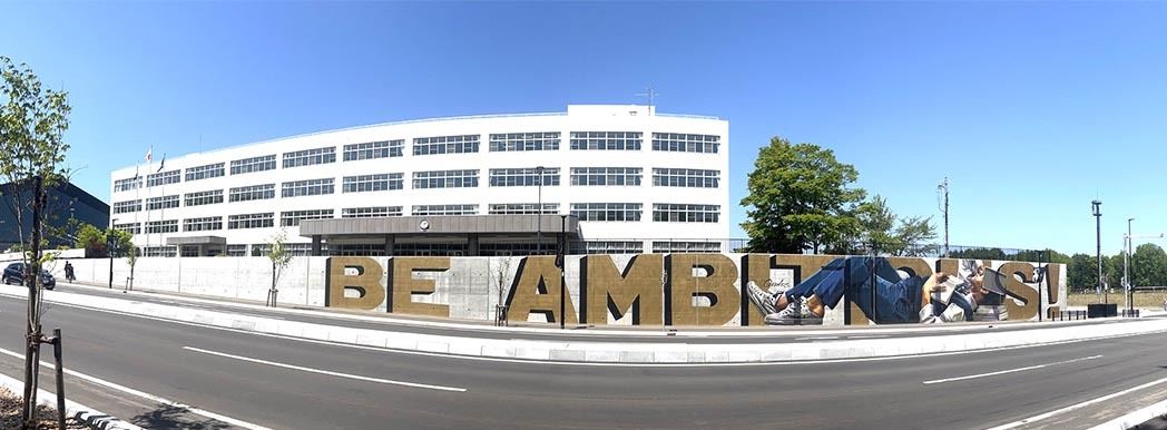 「エスコン―」の隣に位置する北広島高の壁画にもアートを残した。「BE AMBITIOUS」の文字の上に学生が横になっているところを描いている。「授業をサボったりしても大志は芽生えていくもの。間違えたって、止まったっていいんだよってメッセージを出したかった」と赤澤氏。さらに、この壁画を制作する際には同高の生徒たちにも手伝ってもらい、アートの仕事を体験してもらった。