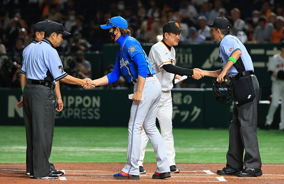 メンバー交換を終えた新庄監督(中央左)と原監督