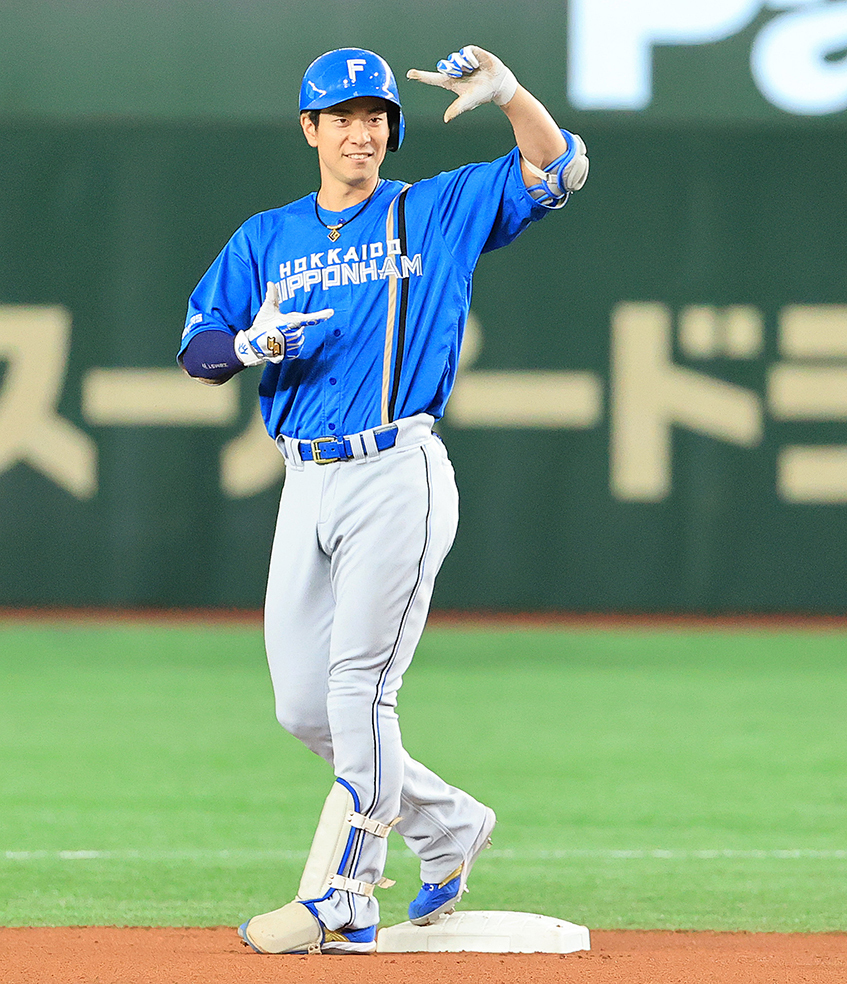 一回無死、ヒットを放った松本剛が塁上でポーズを決める