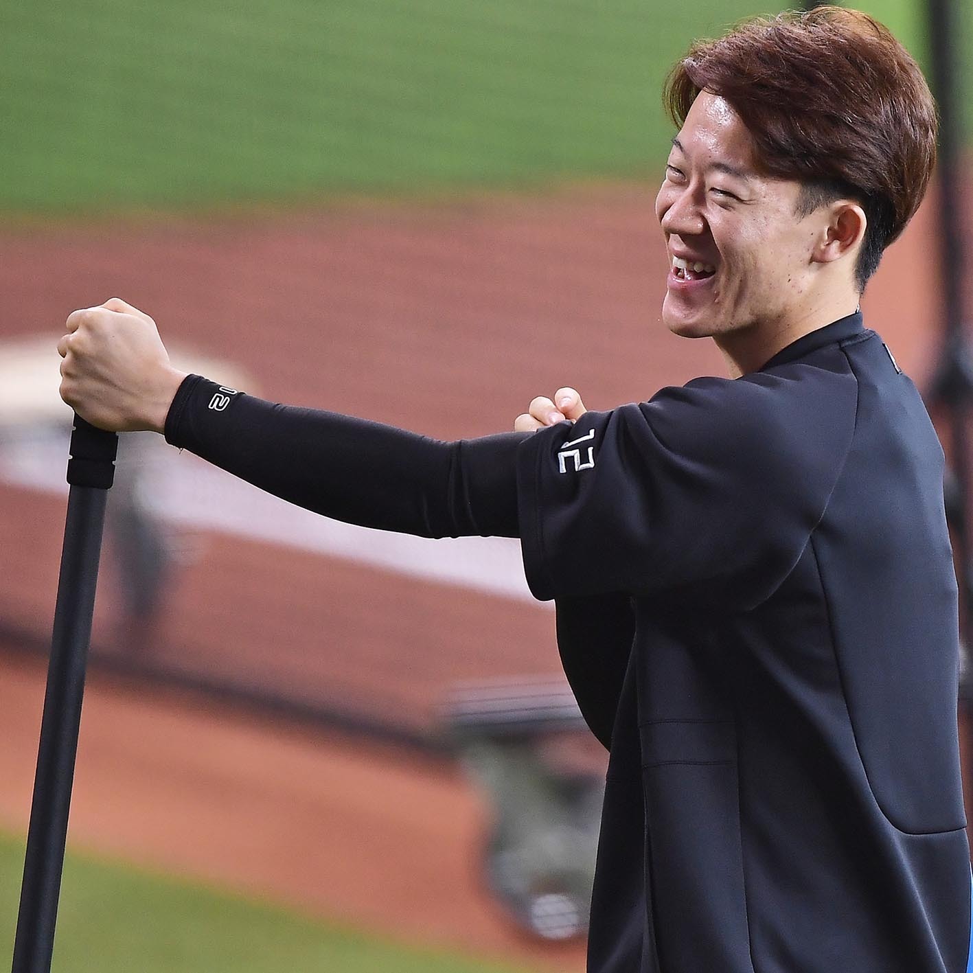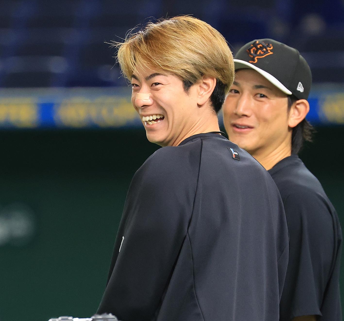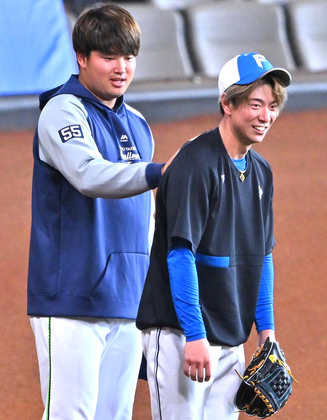 30日、試合前練習でヤクルト・村上(左)に背中を触られる松本剛