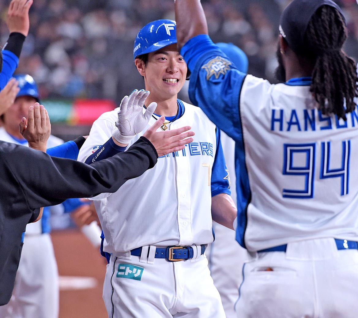 三回2死三塁、松本剛(中央)が2点本塁打を放ちチームメートとハイタッチを交わす