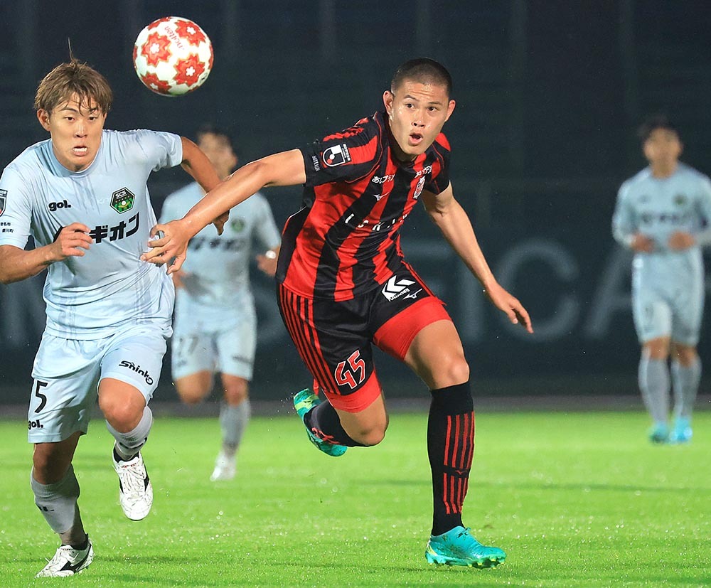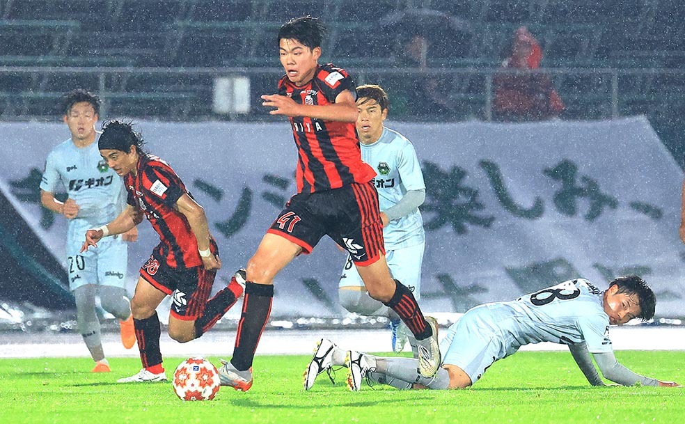 後半途中出場し、ドリブルで攻め上がるMF菅谷(中央)