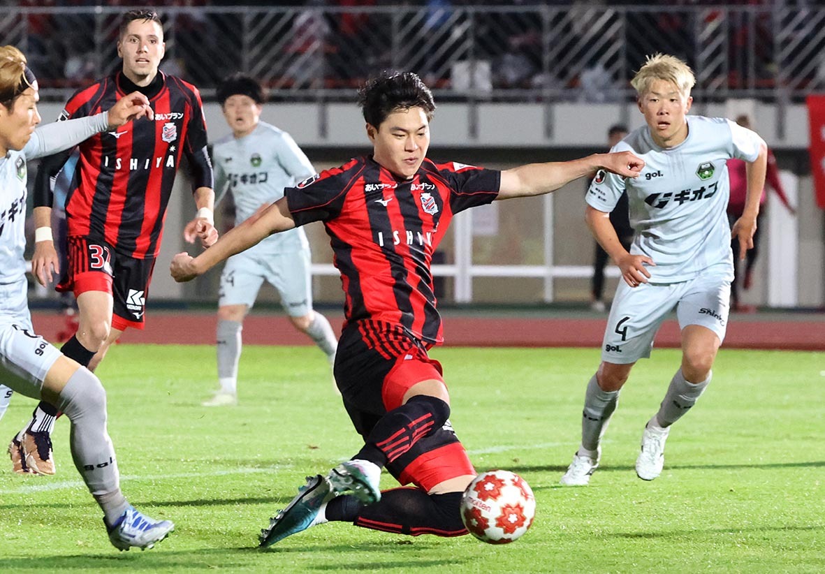 後半8分、先制ゴールを決めるFW金健熙(中央)