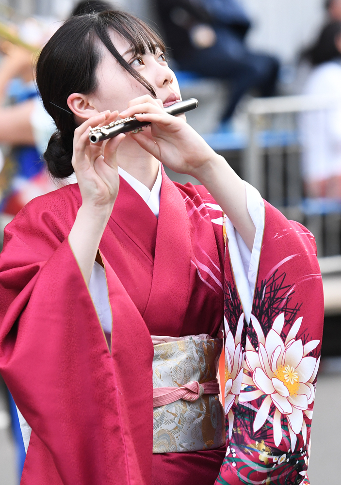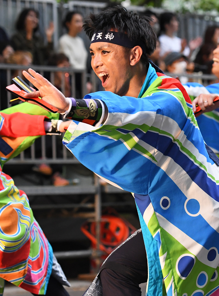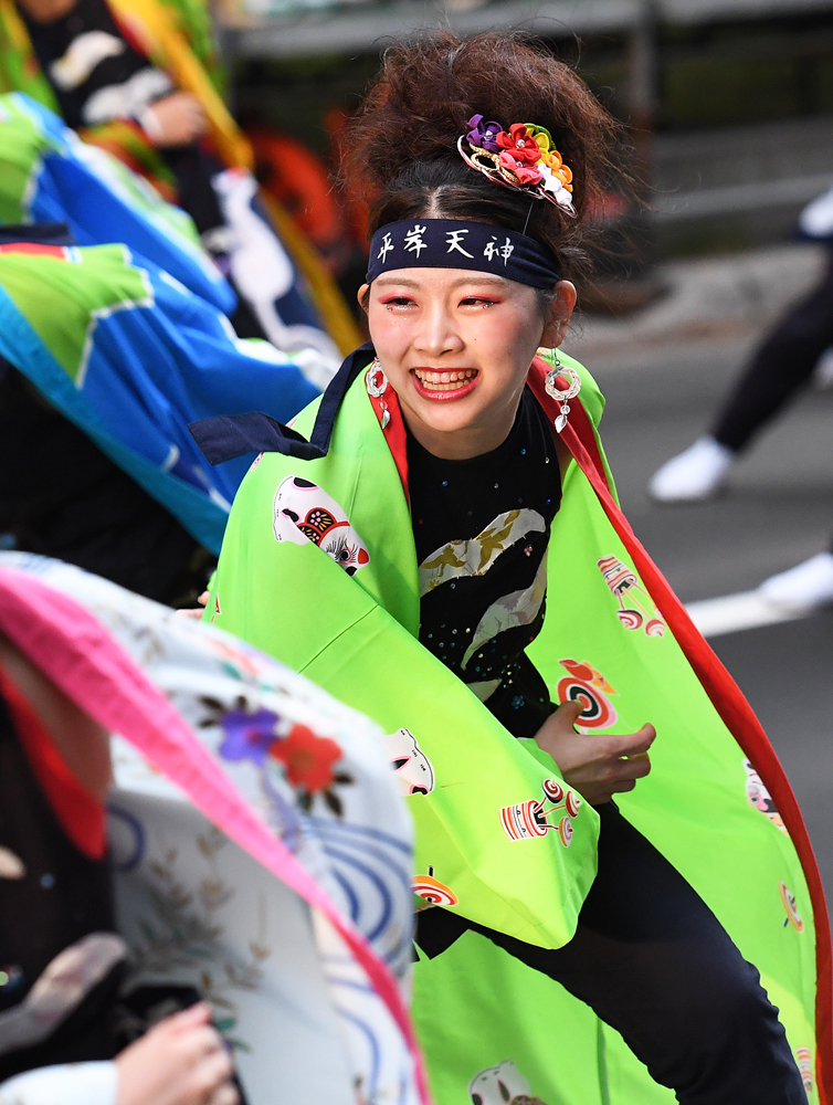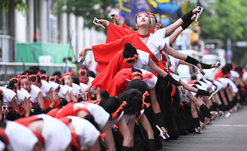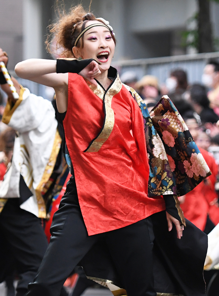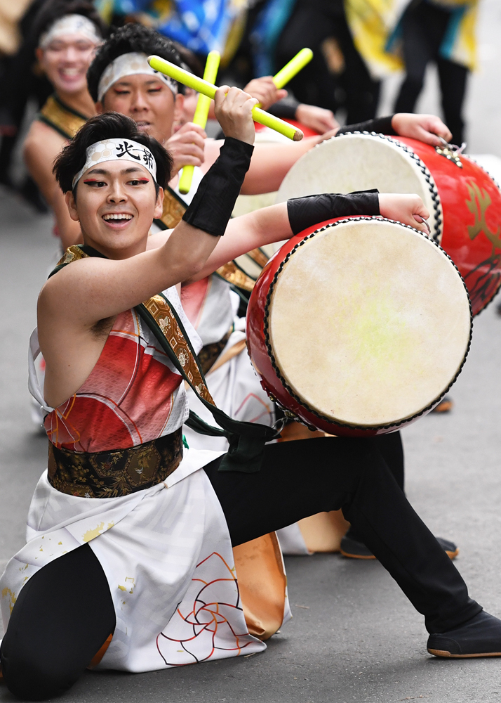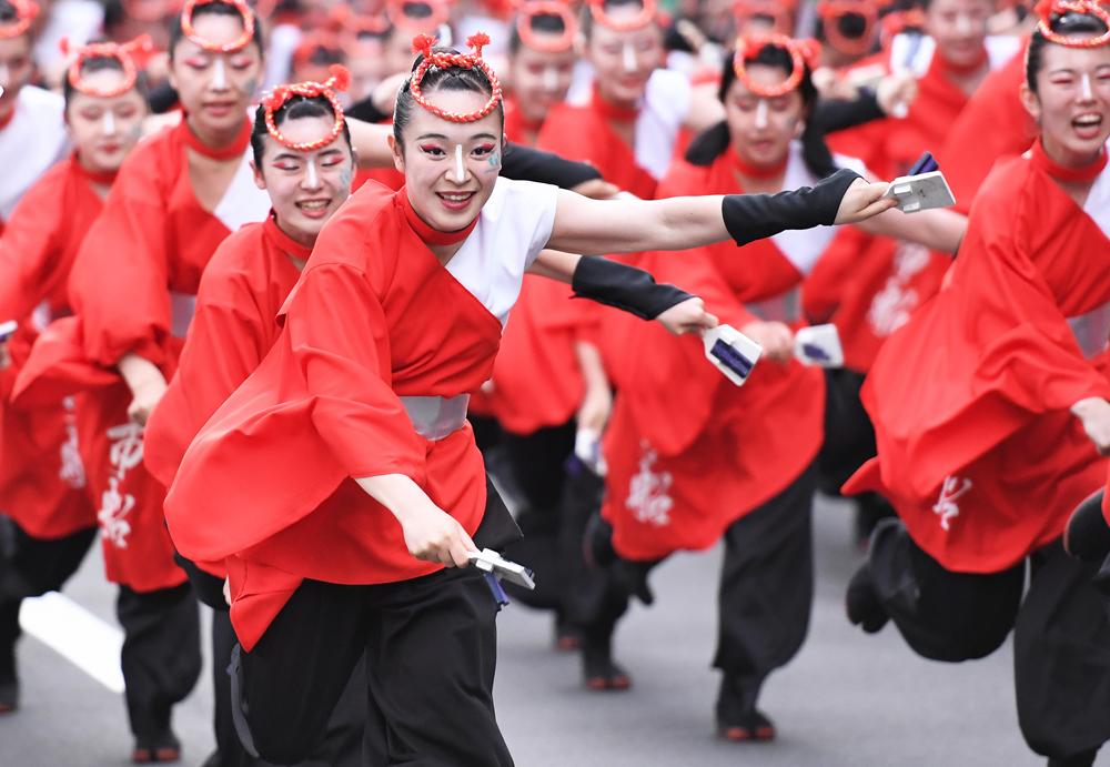 ■撮影した小田岳史カメラマンのコメント 「各チーム違う個性的なパフォーマンスの数々に魅了された。先導するトラックから流れる大音響とともに、正面から迫ってくるような踊り子の演武に圧倒されそうになりながらも必死について行った。夢中になりすぎて、自分の携帯を紛失してしまったことに気付かないくらいシャッターを切っていました! 押忍!」