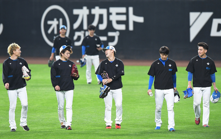 6月7日、練習後に談笑しながら引き上げる左から宮西、鈴木、河野、玉井、宮内