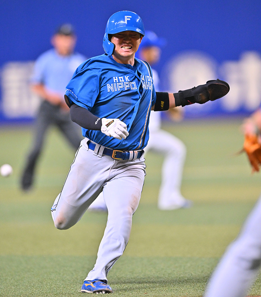 八回無死一塁、万波が右前打を放ち一走・上川畑が三塁に進む