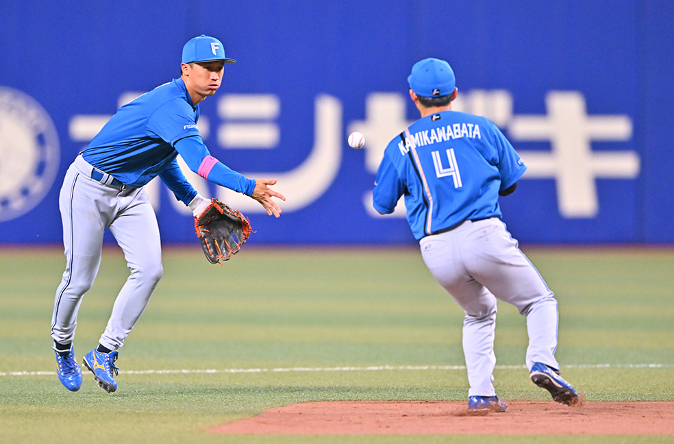 六回無死一塁、ビシエドの打球を捕り上川畑(右)にトスする加藤豪