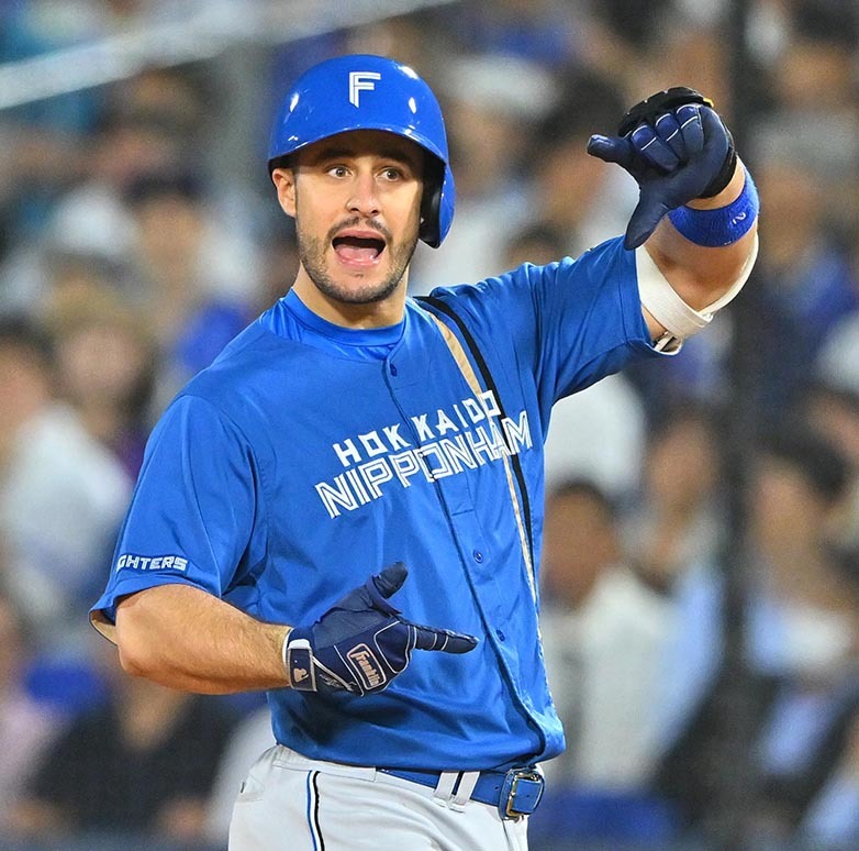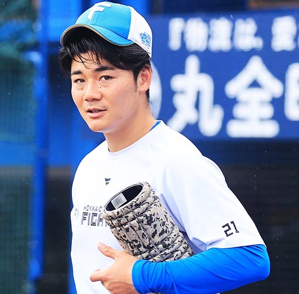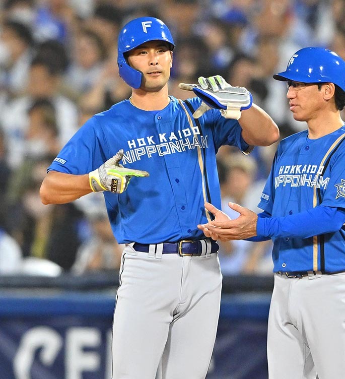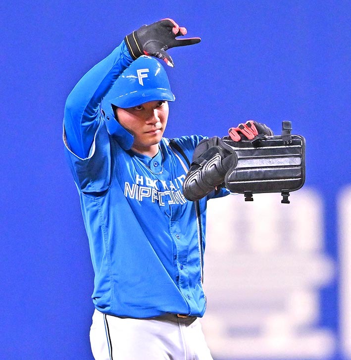 6月16日、中日戦。三回1死二塁、上沢が左前打を放ち、塁上でピクチャーポーズを見せる