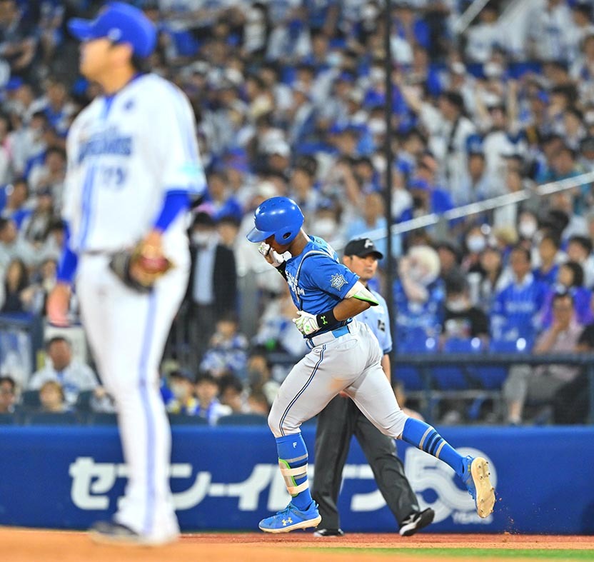 6月19日、DeNA戦。延長十回1死、万波が勝ち越し本塁打を放ちガッツポーズを見せる(左はDeNAの守護神・山崎)