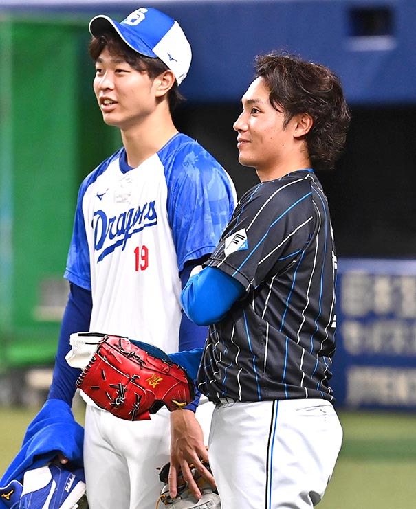 6月16日、中日戦の試合前練習中に中日・高橋宏(左)と話す伊藤