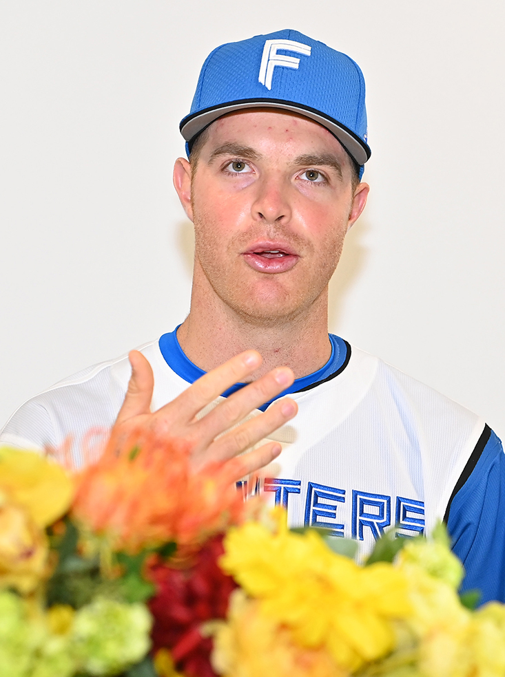 「きょう一軍に合流して初日になりますが、選手、コーチ陣、スタッフとお会いした。鎌ケ谷でも数日間、一緒に野球をしたのですが、皆さん温かく、自分のことを迎えていただいて感謝しています。アメリカから日本に来ることに関して、すごく手助けをしてくれたと思っています。ファイターズの名前の通り、戦う集団の一員になれるように一生懸命頑張っていきたい」