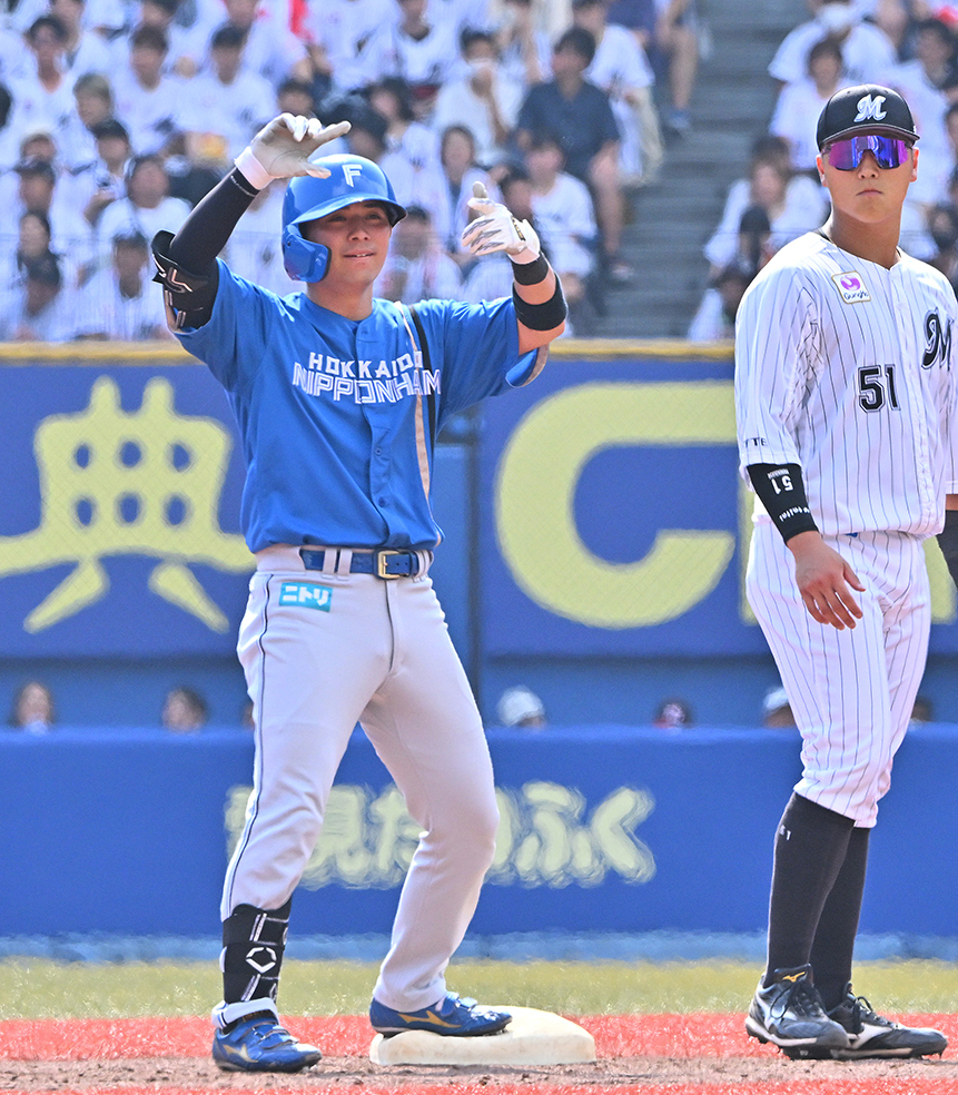 四回1死二塁、上川畑(左)が適時二塁打を放ち塁上でポーズを見せる