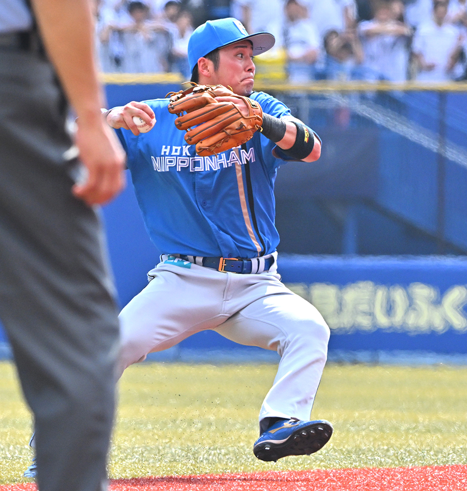 四回2死、田村の打球を好捕し一塁に送球する上川畑