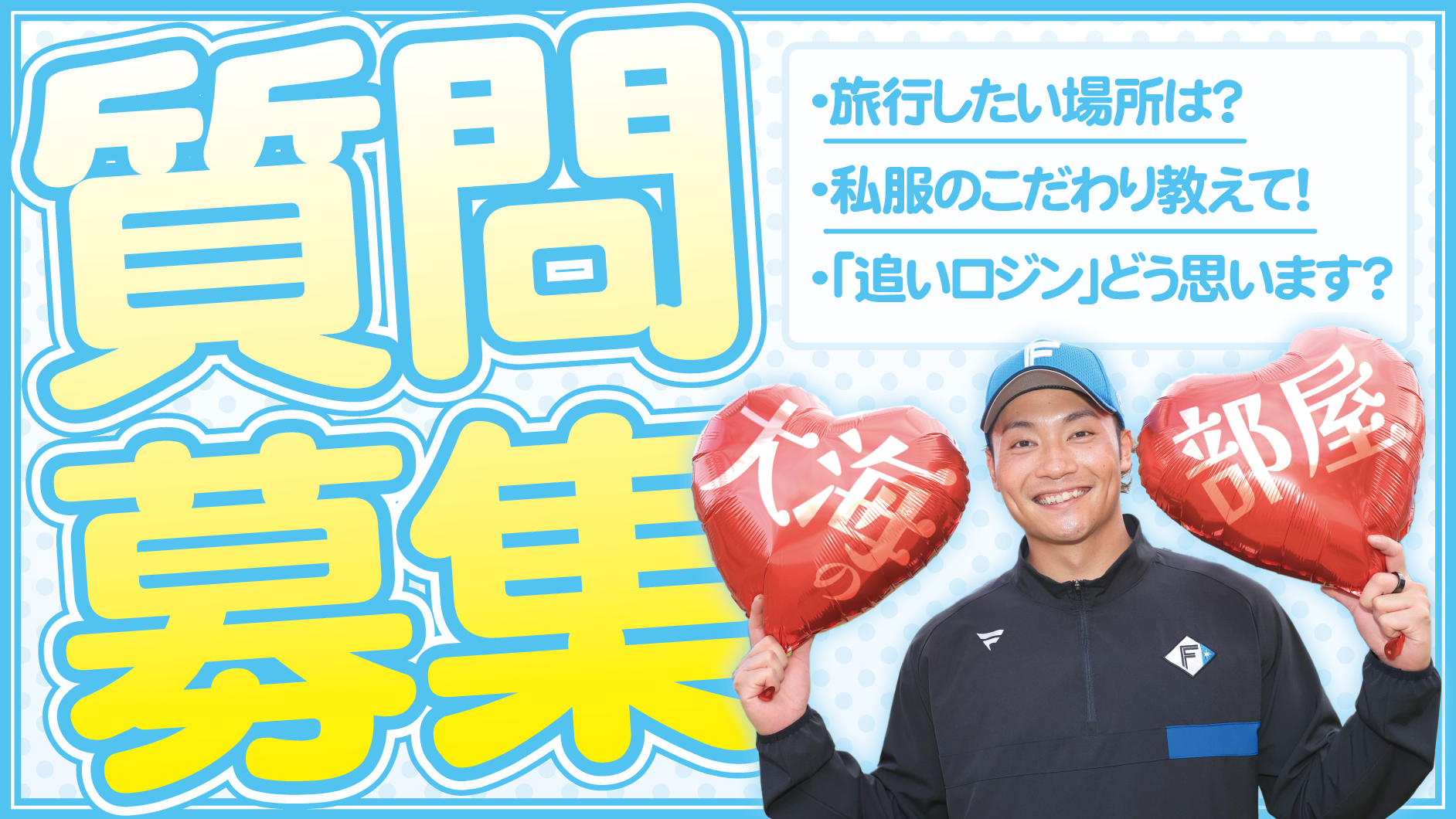 道新スポーツWEBと北海道新聞で掲載中の手記『大海の部屋』では、ファンの皆さまから伊藤大海投手への質問を募集しています! 野球のことからプライベートなことまで、どしどしお寄せください。
