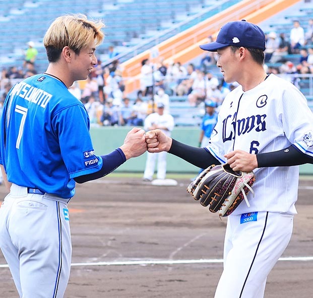 6月27日の試合前、西武・源田(右)と挨拶を交わす松本剛
