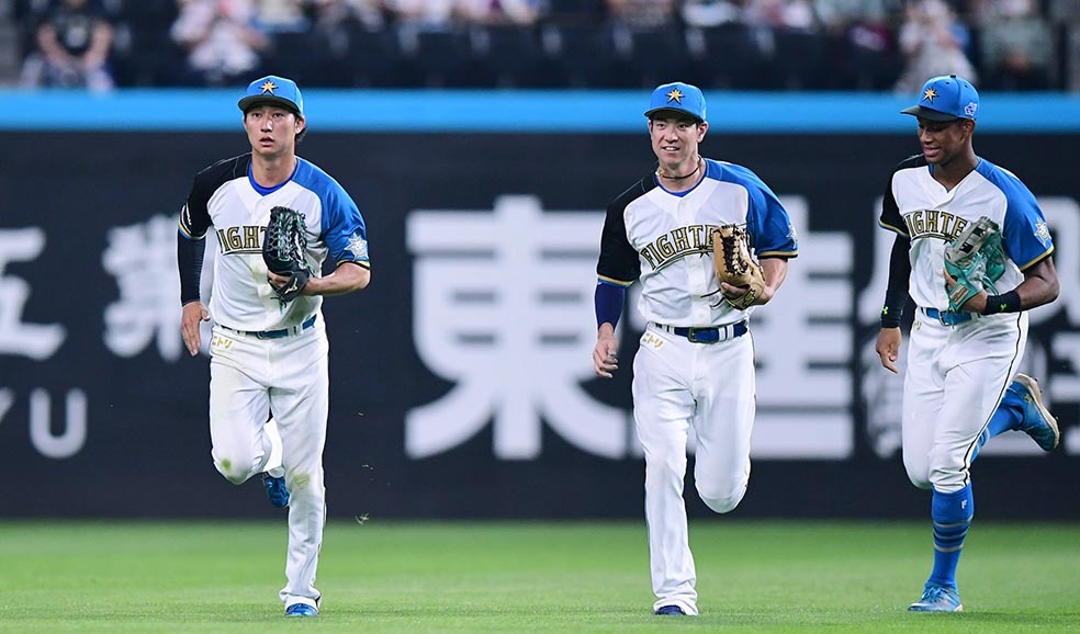 二回2死、オリックス・杉本の打球を好捕した浅間(左)と松本剛、万波が揃ってベンチに戻る