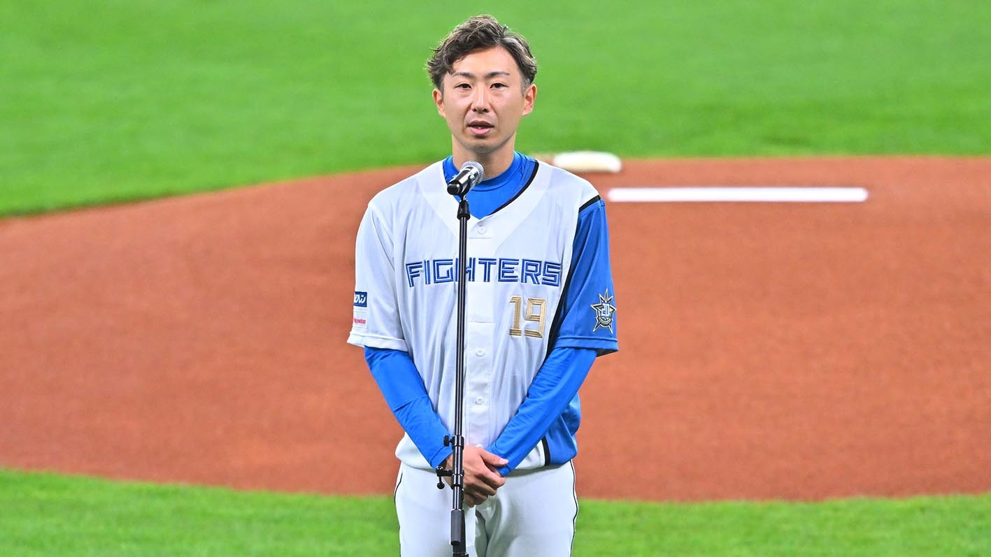 「まず、本日はシーズン中にもかかわらず、このような場を設けていただき、北海道日本ハムファイターズ、オリックスバファローズの関係者の皆さま、本当にありがとうございます。僕の気持ちをしっかり伝えたいと思っていますので、紙を見て話させていただきます。きょう背番号19を貸してくれた玉井、山岡、ありがとうございます。そして、玉井ファンの皆さま、山岡ファンの皆さま、ありがとうございました。この後、試合が控えていますので、短めに話させていただきます。