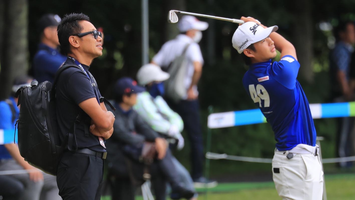 早朝便で片岡(右)の元に駆けつけた谷コーチ。スタート前の練習場でスイングをチェック