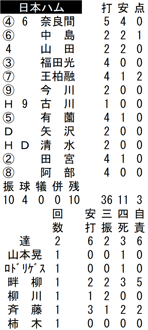 打線は一回、王柏融外野手(29)の5号2ランで先制。五回には中島卓也内野手(32)のタイムリーで1点を奪取したが、大量失点が響いた。