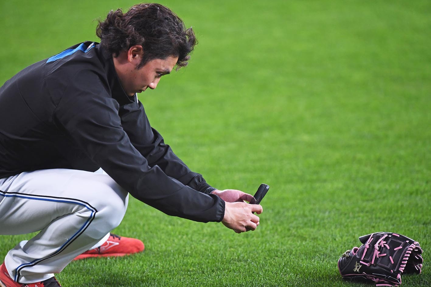 6月30日、試合前練習中に新しいグラブ?の撮影をする伊藤