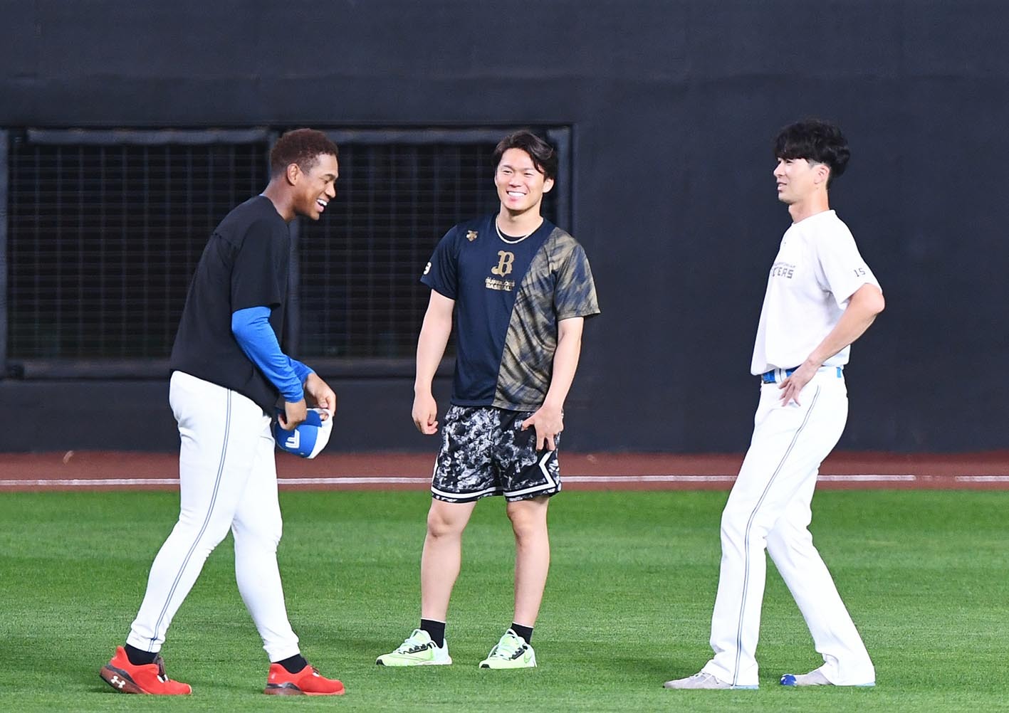 6月30日、試合前練習中に談笑する(左から)万波、オリックス・山本、上沢