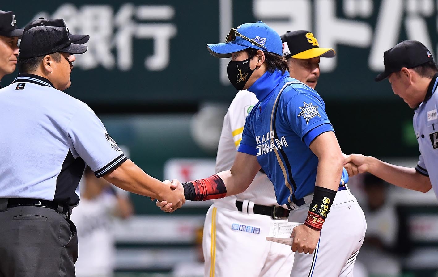 メンバー表を交換する新庄監督(手前)とソフトバンクの藤本監督