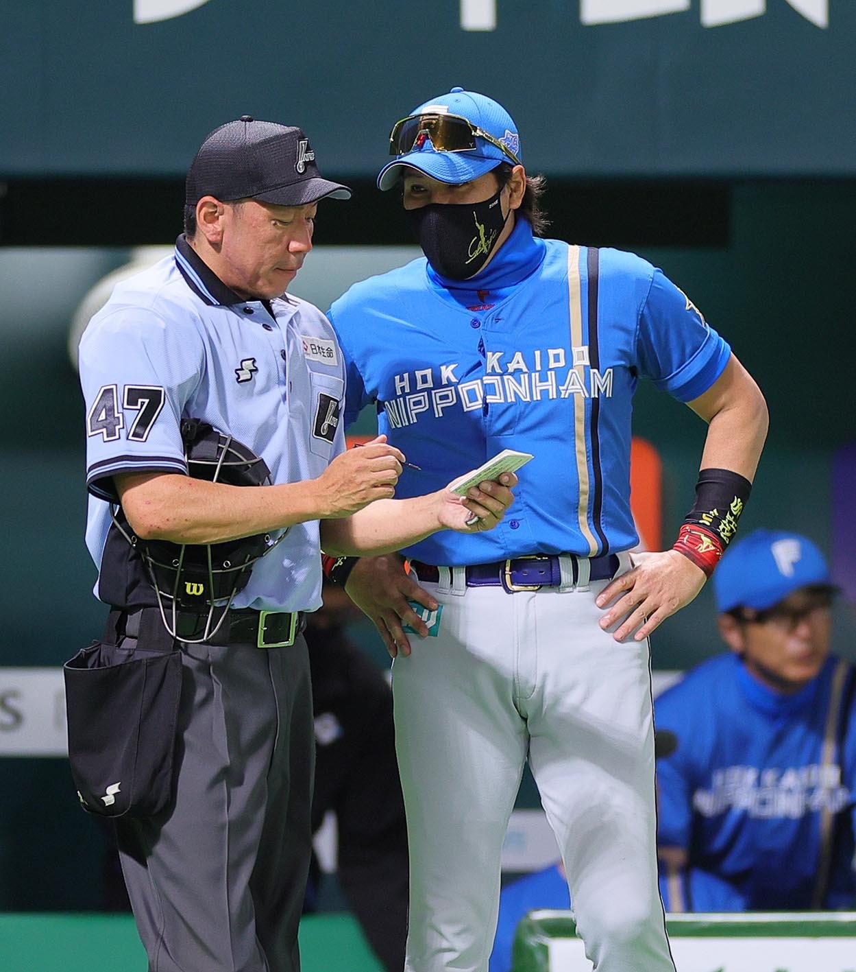 二回1死二、三塁、鈴木がソフトバンクの近藤に2点二塁打を浴び、新庄監督は(右)は審判に投手交代を告げる