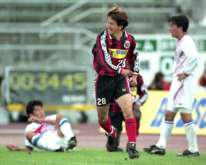 1997年6月1日の西濃運輸戦、前半34分に地元初ゴールを決めて喜ぶ札幌時代の山橋監督(中央)