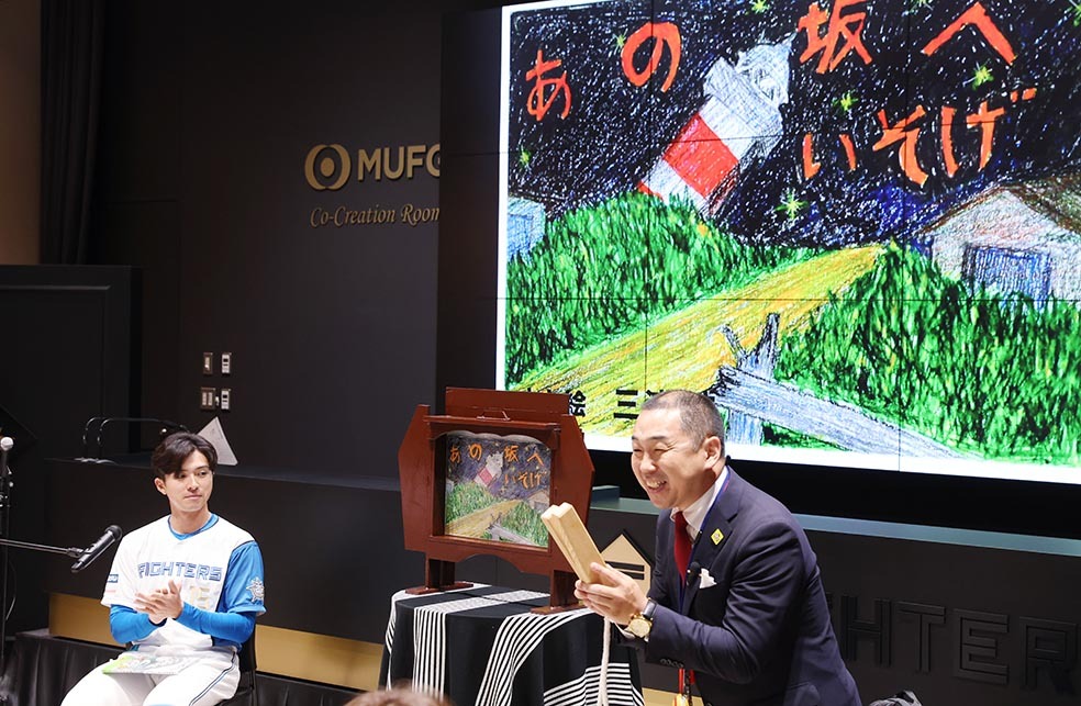 球団オフィシャルファンクラブ会員の親子25組50人が参加した。三浦さんが自らの実体験をもとにした絵本「あの坂へいそげ」を読み、上沢が2冊目の読み聞かせを担当。「災害は準備が大切だと思う。この絵本から普段、心がけておくことが学べる」と伝え、災害時に守るべき五つの約束が書かれたシールを子どもに手渡していた。