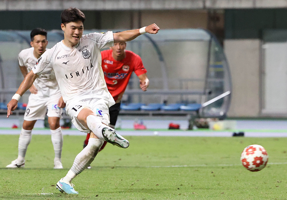同36分、ボールを受けたDF田中宏がドリブルで右サイドを独走。ペナルティーエリア内へ進入し、逆サイドにいたFW金健熙へラストパス。金健熙がボレーシュートを放つが相手GKのビッグセーブに阻まれ、惜しくもハットトリックはならなかった。同40分、左サイドで抜け出したFWミラン・トゥチッチ(26)を相手GKがペナルティーエリア外で倒し一発退場。同43分に途中出場のFW出間思努(18)がドリブルで持ち上がり、ペナルティーエリア外から左足で豪快なミドルシュート。公式戦初ゴールを決めた。同アディショナルタイムにも、左サイドのFW菅大輝(24)からのクロスに再びFW出間が中央で合わせて5点目をゲットした。
