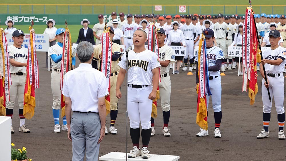 小野主将が思いのこもった選手宣誓を堂々と行った。「プレーボールと共に鳴り響くサイレンの音。ボールを捉えたときの金属音。いいプレーが起きた時の割れんばかりの歓声。胸が高鳴る吹奏楽の演奏。ゲームセットと共に入り交じる、さまざまな感情。私たちは高校野球を愛しています。18.44メートルの間で繰り広げられる約0.5秒の瞬間の攻防。楽しいことばかりではなかった、長く苦しい3年間の積み重ねの答えを出す瞬間。この一瞬で人生を変えられる。ここに高校野球の面白さと残酷さがあります。この一瞬で奇跡を生むために私たちは3年間、真剣に野球と向き合ってきました。応援してくださるたくさんの仲間や家族、大勢の方々からの声援を体中に響かせて、北の高校球児らしく正々堂々と戦う事を誓います」。