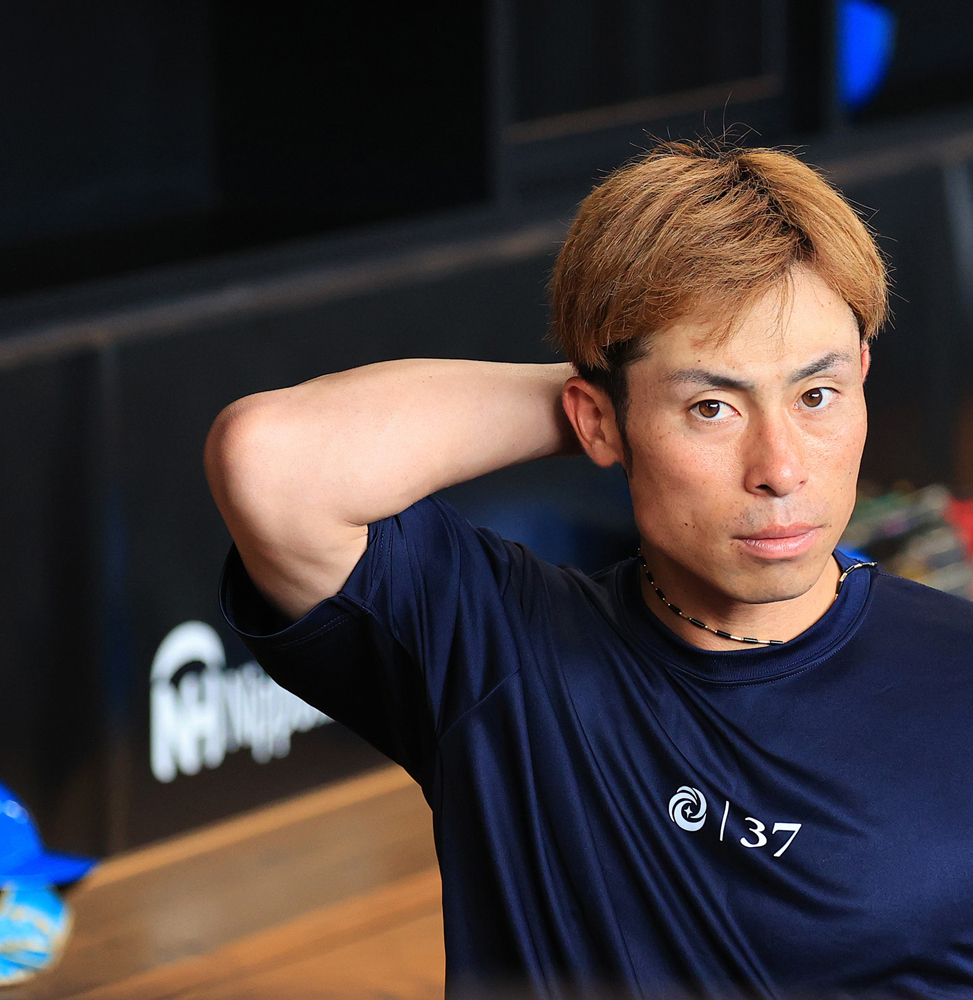 8日のロッテ戦、練習前にリラックスした表情を見せる江越