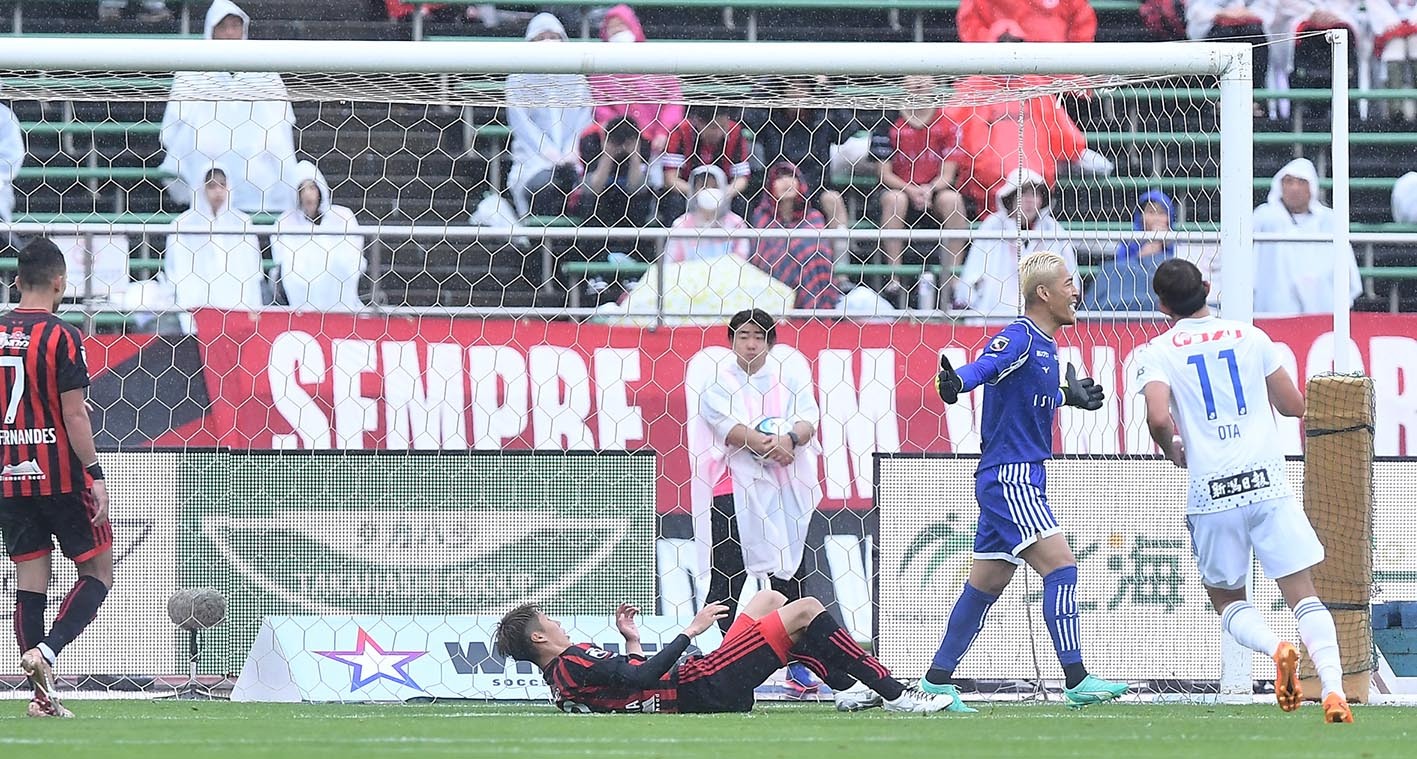 スコアレスで折り返した後半8分、新潟に試合を動かされてしまう。左サイドでMF藤原奏哉(27)にマークを外されペナルティーエリア内への進入を許すと、ゴール前へのグラウンダーのクロスをFW鈴木孝司(33)に右足で合わされ先制を許した。鈴木をマークしていたDF田中駿汰(26)は「ピンポイントで合わされてしまった」と失点の場面を振り返る。
