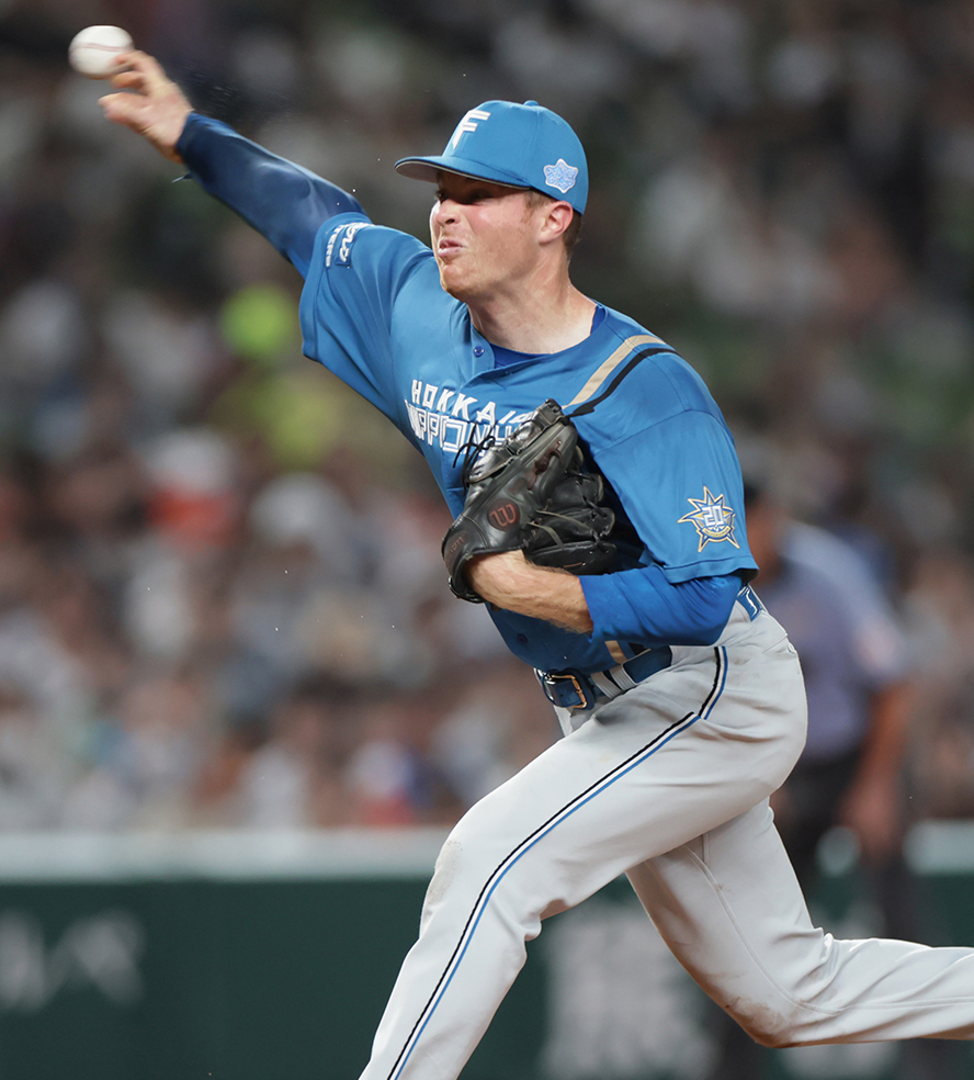 「スライダーです。きょうはかなりアドレナリンが出ていたので、スライダーはちょっと配球に苦しむというか、思った通り投げられないってところがあった。これからしっかりと調整をしていって、NPB、ファイターズの野球に慣れていくことができれば、スライダーに関してもしっかりと自分の思う通りに投げることができてくると思うので、そこは自分で突き詰めてていきたいなと思います」