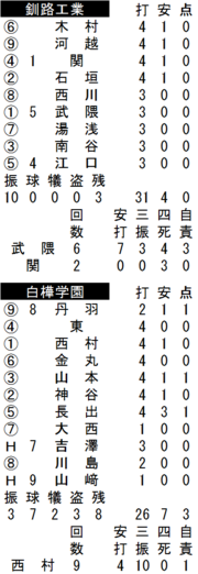 釧路工業もすぐに反撃し、三回1死から2連打で一、二塁とすると、連続暴投で1点を返したが、四回以降は白樺学園・西村昴浩投手(3年)の前に脱線が沈黙。九回までパーフェクトに抑えられ、逆転の糸口を見いだせなかった。逆に白樺学園は七回に1点を追加し逃げ切った。