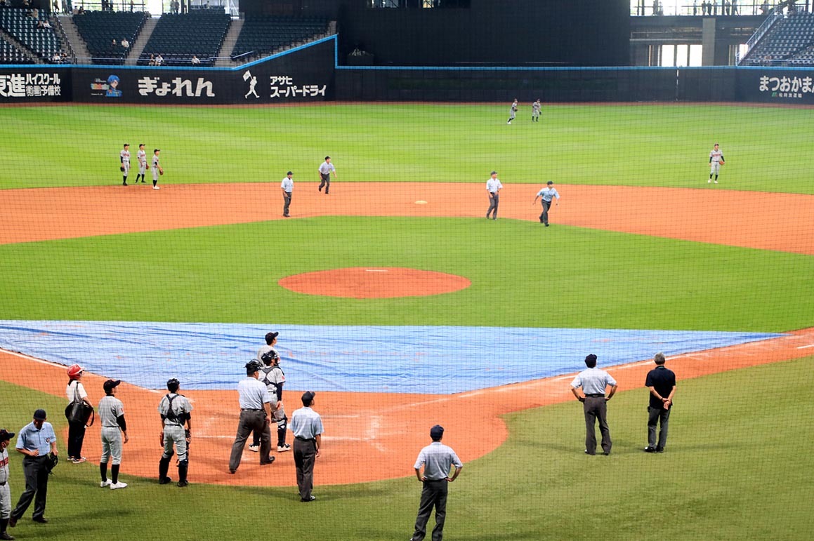 審判員の先生らにとっても初めての球場。講習会は2時間以上に渡った。北大会3試合を担当するのは10人。2015年の選抜甲子園に審判員として派遣された道高野連審判部の小倉貴彰総務副委員長(49、富良野)は「バックネット裏の懐の広さは甲子園みたい」と、新球場の第一印象を話してくれた。公式練習前にいったん閉じられた屋根が公式練習後に再オープン。青空が顔をのぞかせたが、大会中は公平性を期して開閉式の屋根は閉鎖して試合が行われる。