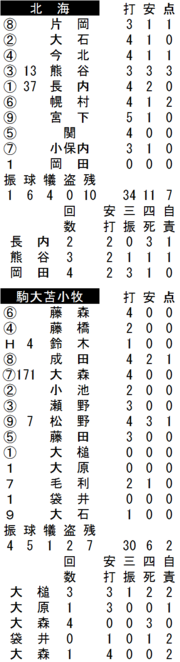 北海が春夏優勝へ王手を掛けた。中盤まで1点差と競った展開だったが、九回に北海が打者9人の猛攻で4得点を挙げて試合を決めた。投手陣も先発の長内陽大投手(3年)が2回1失点、熊谷陽輝投手(3年)が3回1失点とつなぎ、最後はエースの岡田彗斗投手(3年)が4回無失点の好投を見せ駒大苫小牧打線の反撃を封じた。