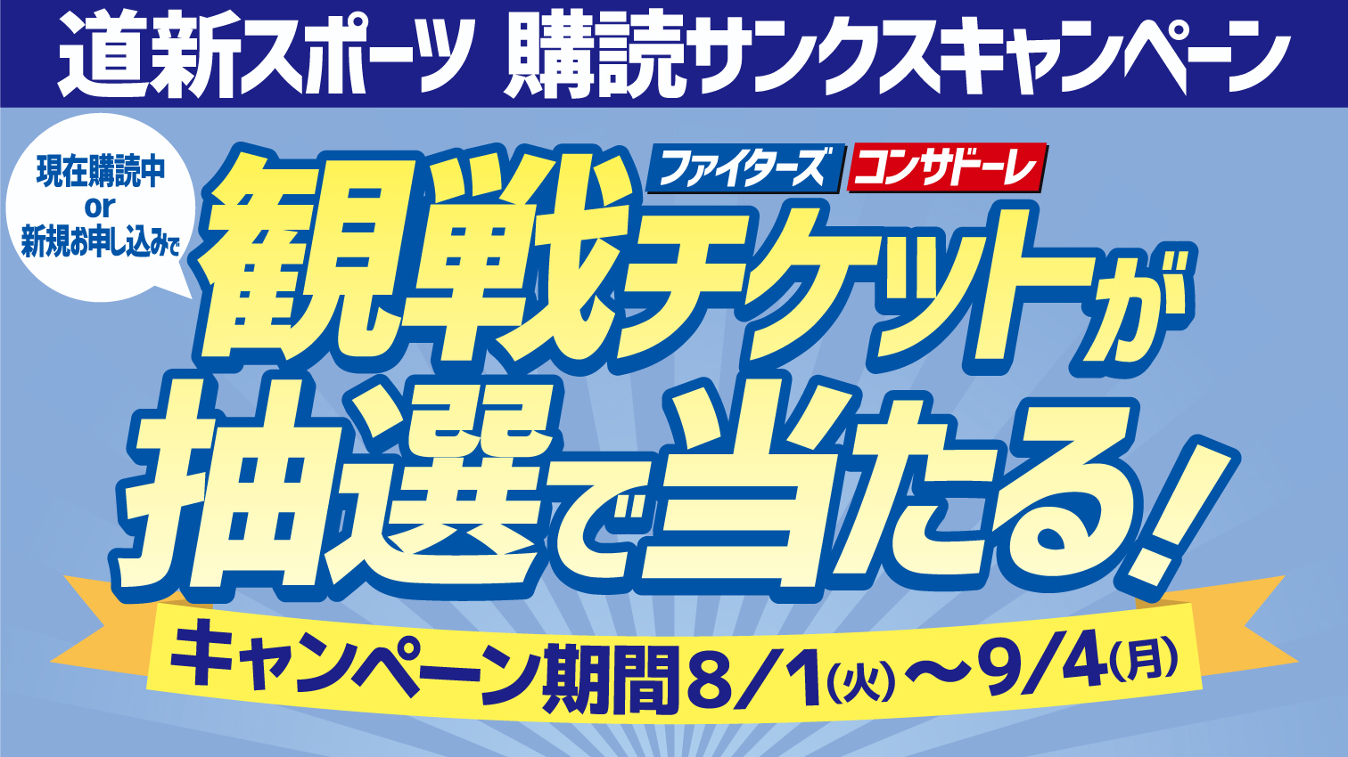 道内のスポーツの魅力を伝える「道新スポーツデジタル」では、日ごろのご愛読に感謝して、北海道日本ハムファイターズ・北海道コンサドーレ札幌の観戦チケットなどが抽選で当たる「購読サンクスキャンペーン」を実施します。
