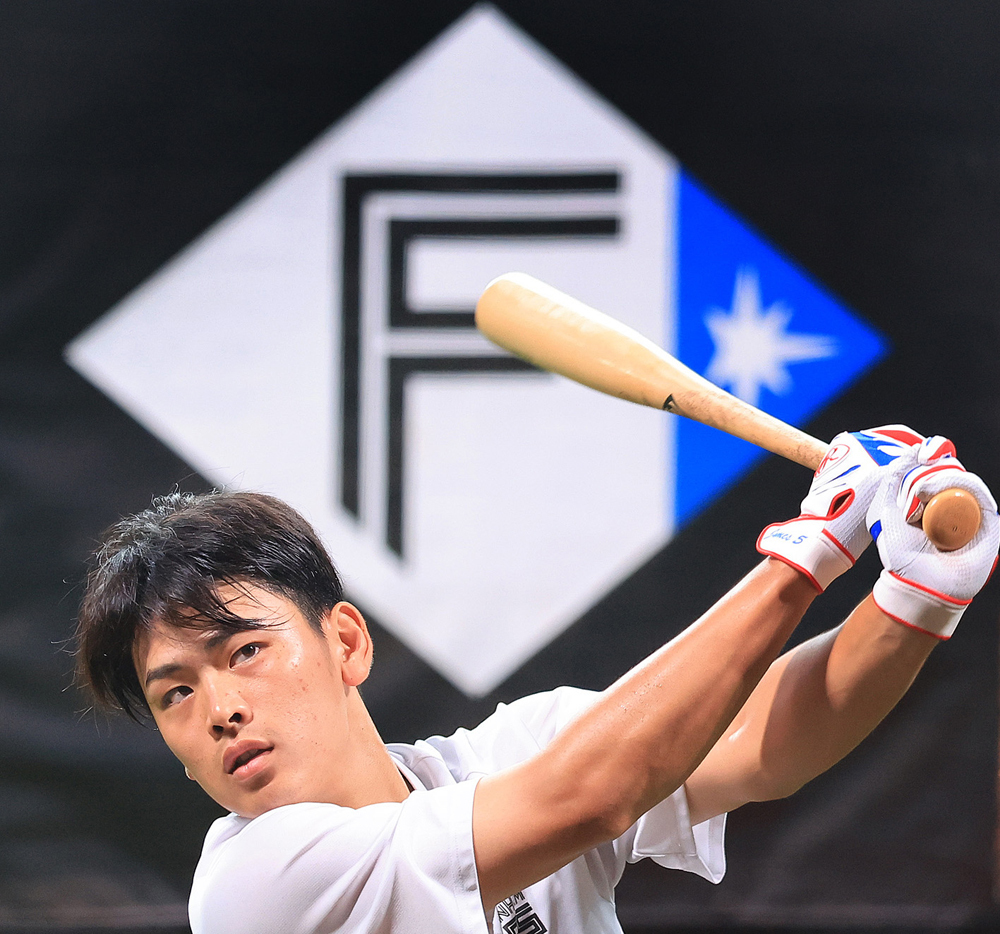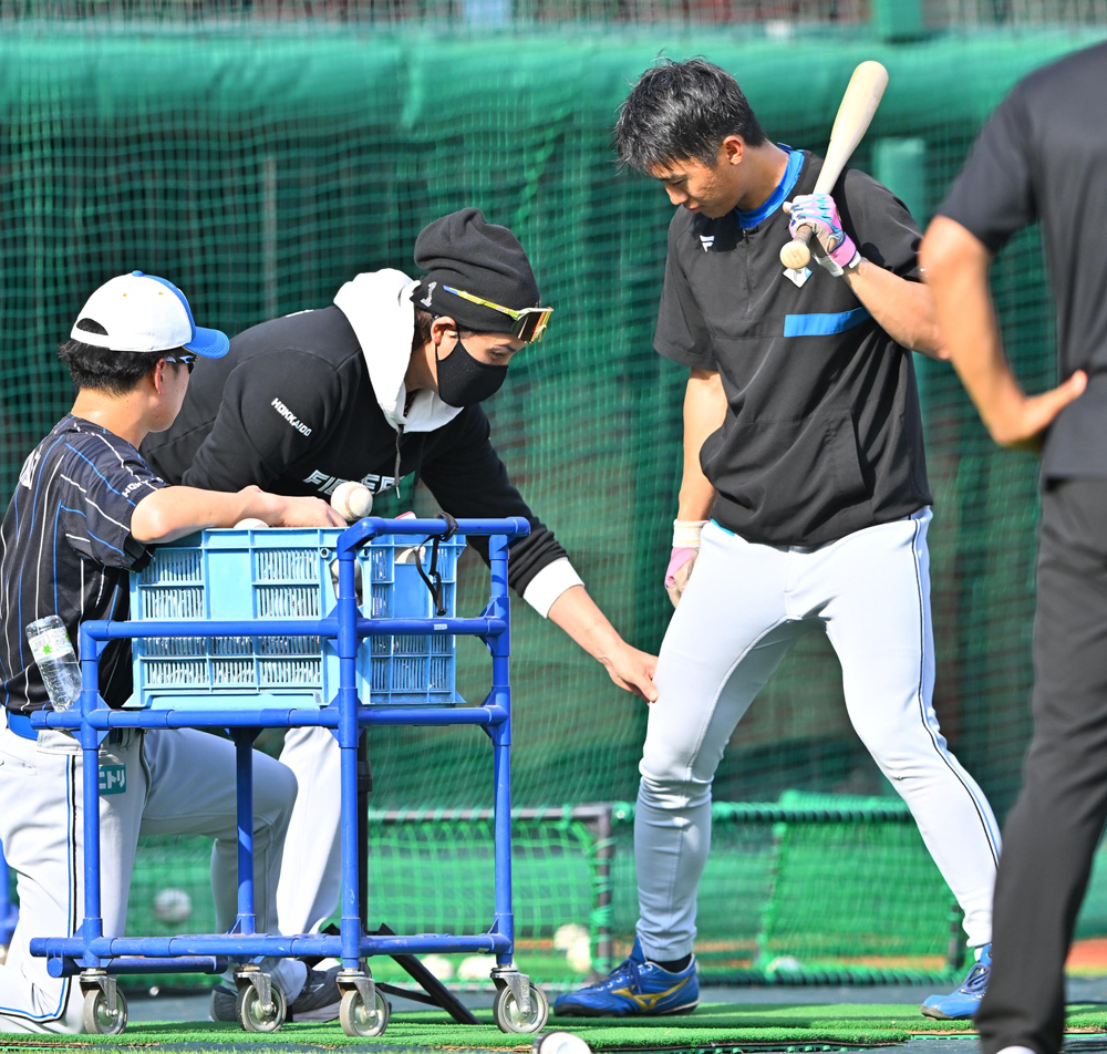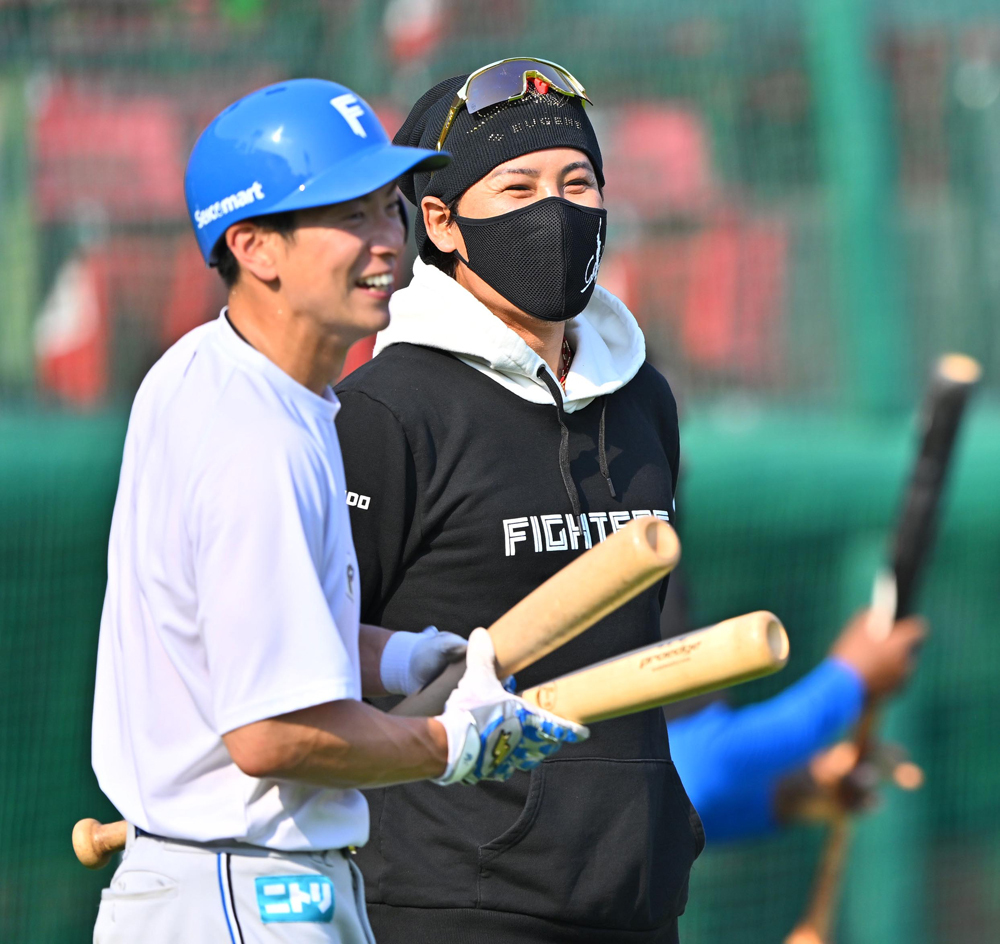 25日、試合前練習で松本剛(左)と話す新庄監督