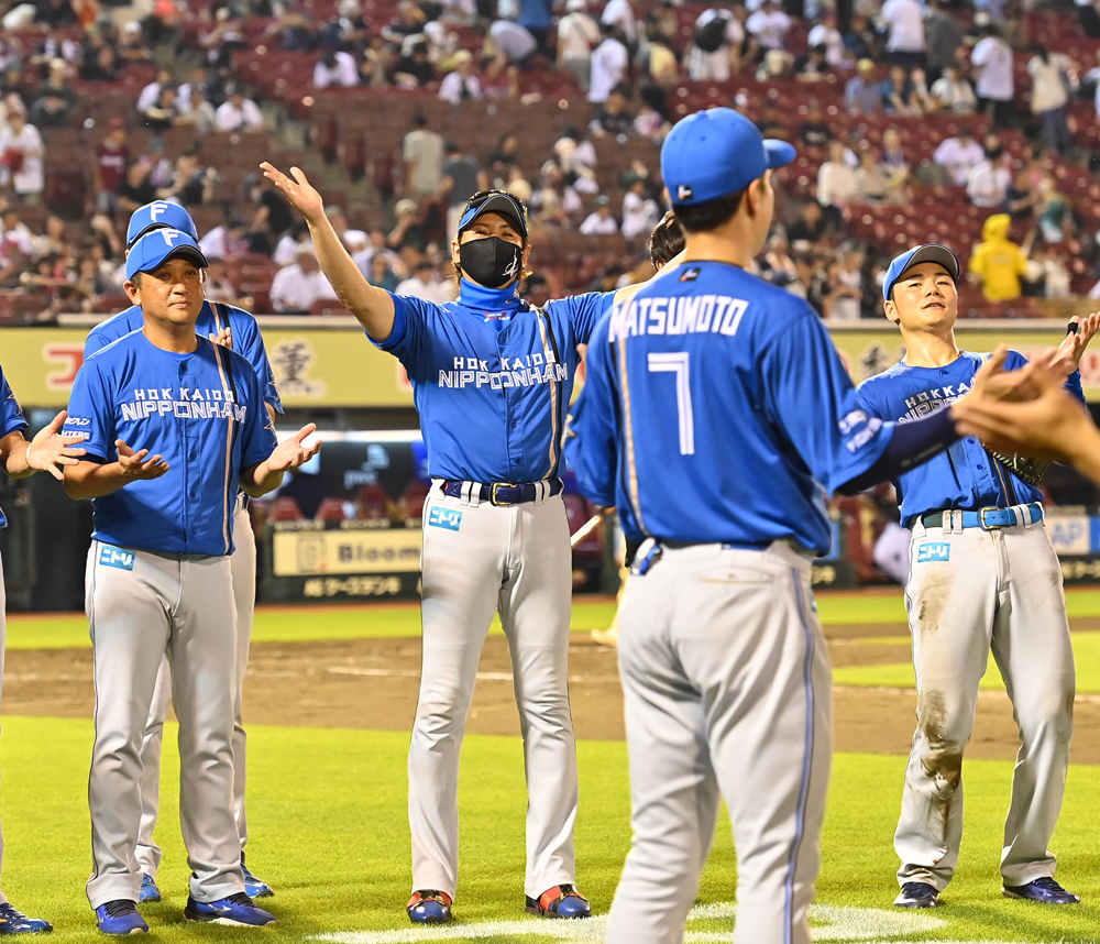 連敗を13で止めた26日の楽天戦後、勝利の一丁締めをする新庄監督と日本ハムナイン