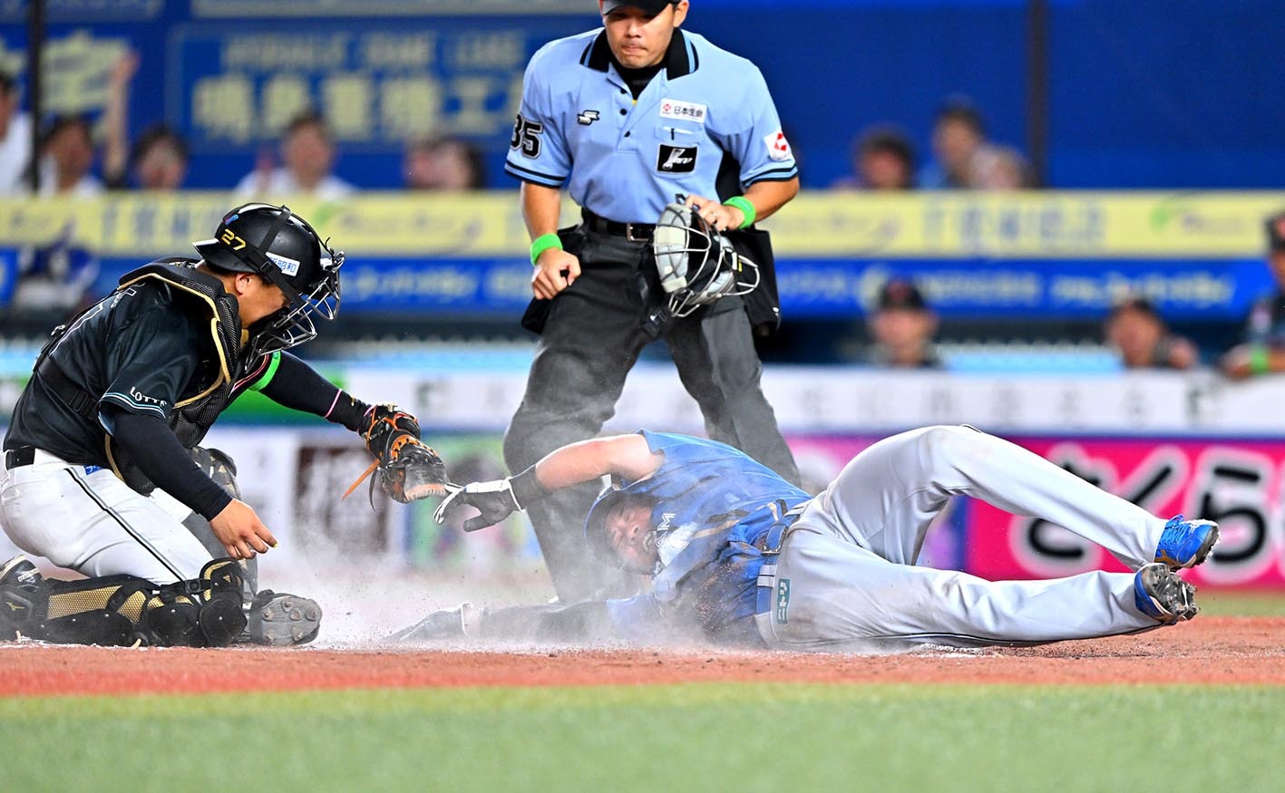 七回2死二塁、五十幡の中前打で二走・伏見が本塁を狙うもアウトになる