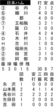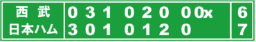 投げては先発した二刀流ルーキーの矢沢宏太投手兼外野手(23)が1回を打たせて取ってパーフェクトに封じた。2番手登板した山本晃大投手(24)は2回4失点。3番手の長谷川威展投手(23)も2回2失点と打ち込まれたが、4番手の生田目翼投手(28)が六回の1イニングを無失点に抑えた。八回、西武の攻撃中に雨脚が強まり、コールドとなった。